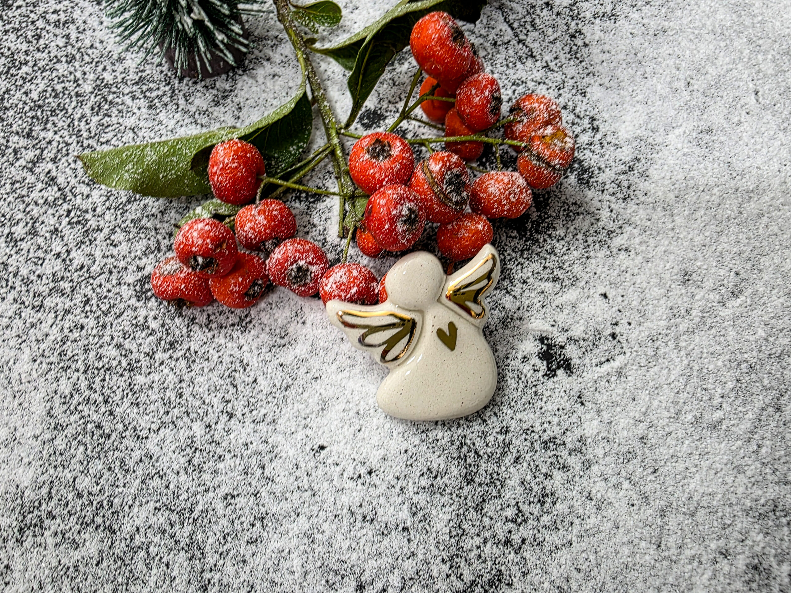 Broșa este lucrată manual, glazurată și arsă la 1020 grade, apoi decorata cu aur coloidal. Dimensiuni – 3,5/2cm