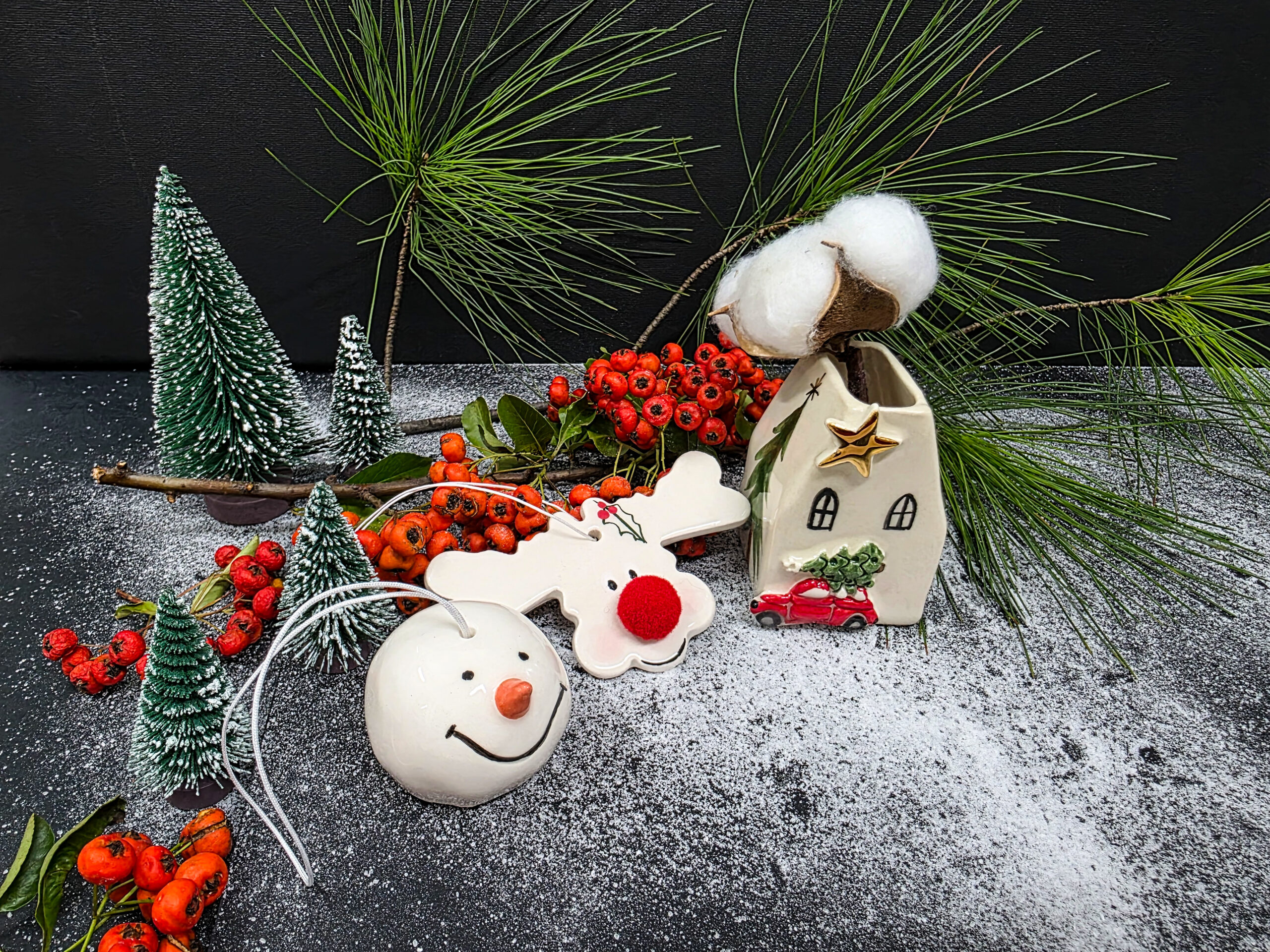 Pachetul cadou contine 2 ornamente și o minivază lucrate manual, decorate cu pigmenti ceramici și arse la 1020 grade.